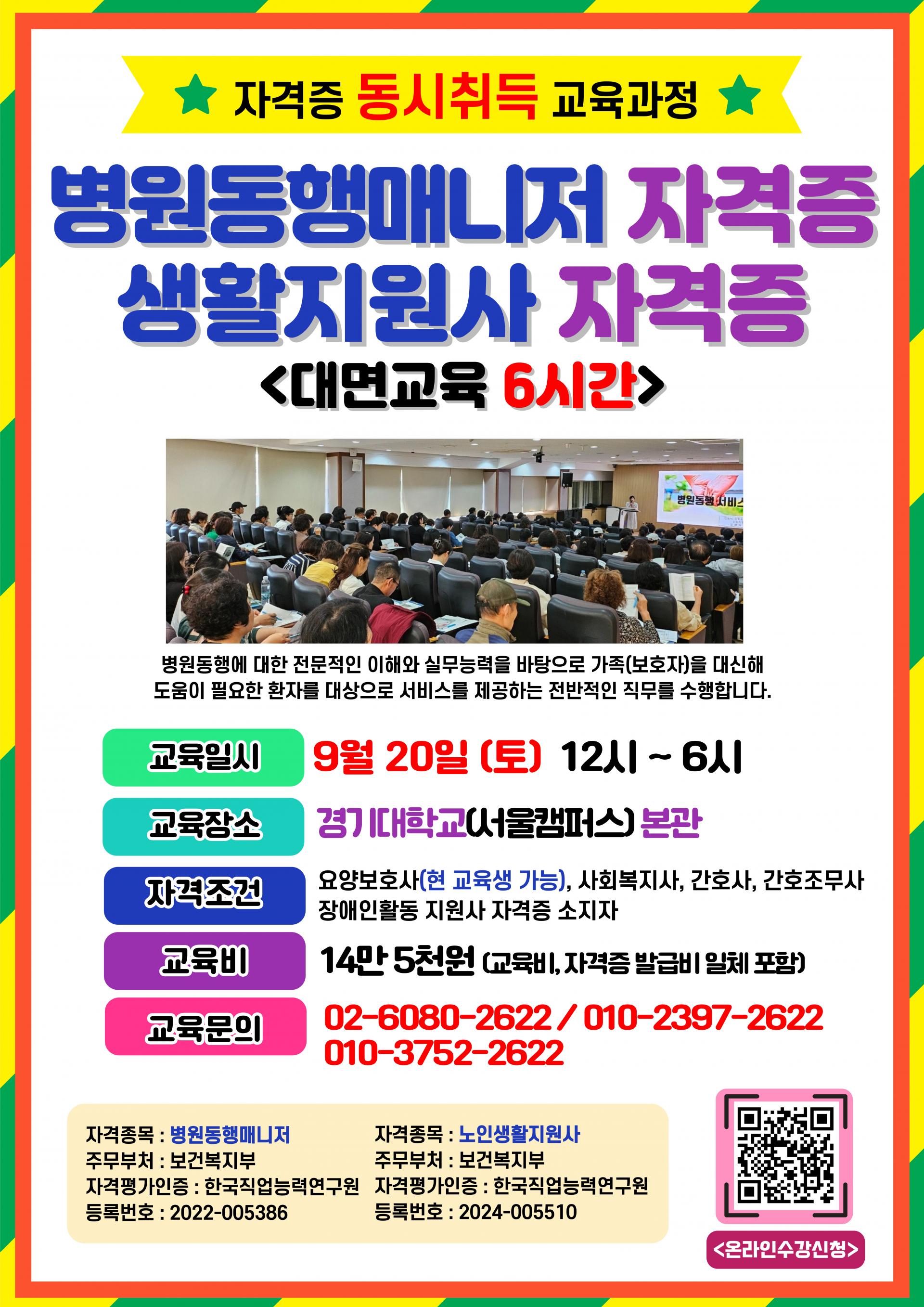 "병원동행매니저+생활지원사" 25년 9월 [9월 20일]과정 교육생 모집 중에 있습니다.