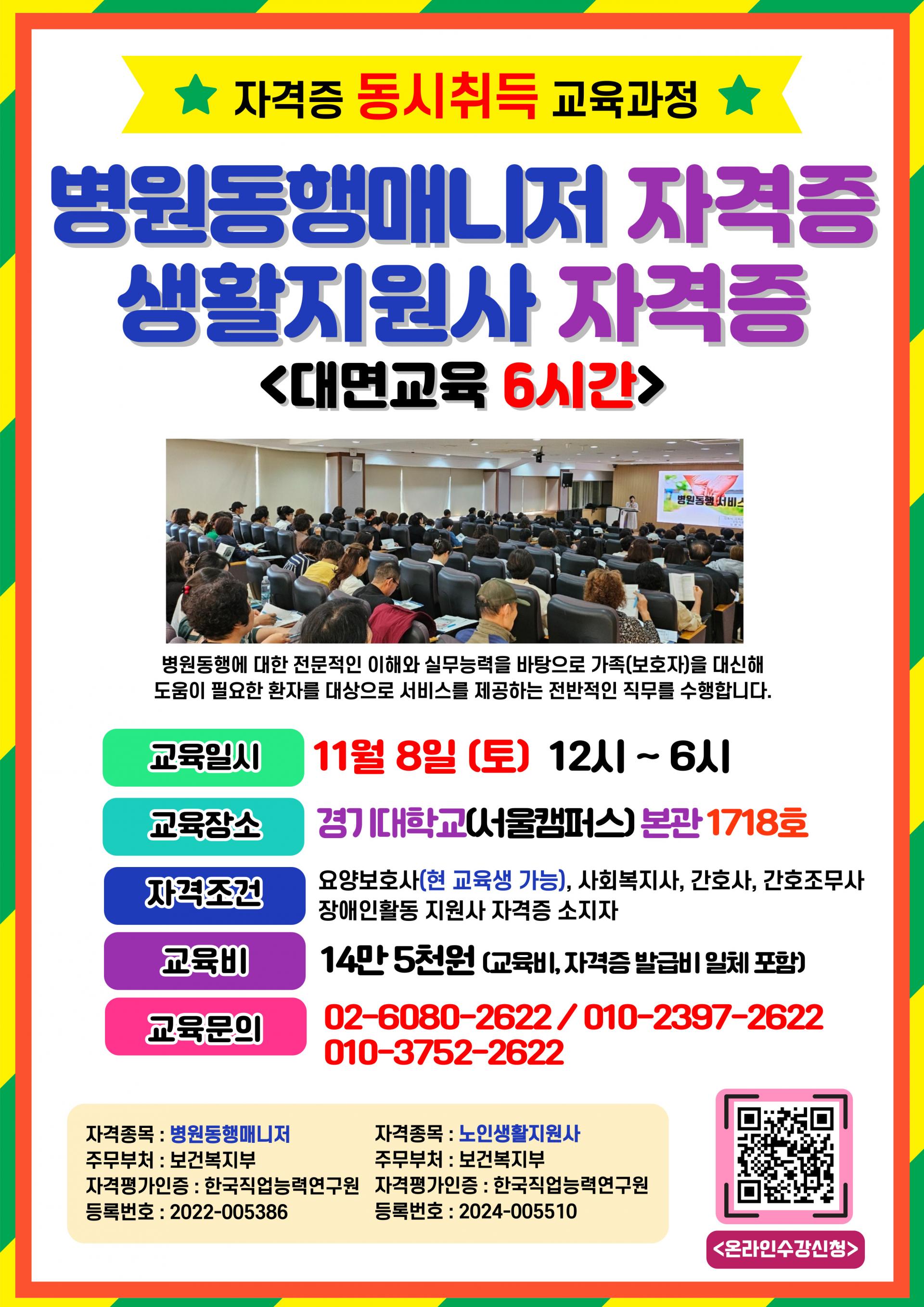 "병원동행매니저+생활지원사" 25년 11월 [11월 8일]과정 교육생 모집 중에 있습니다.