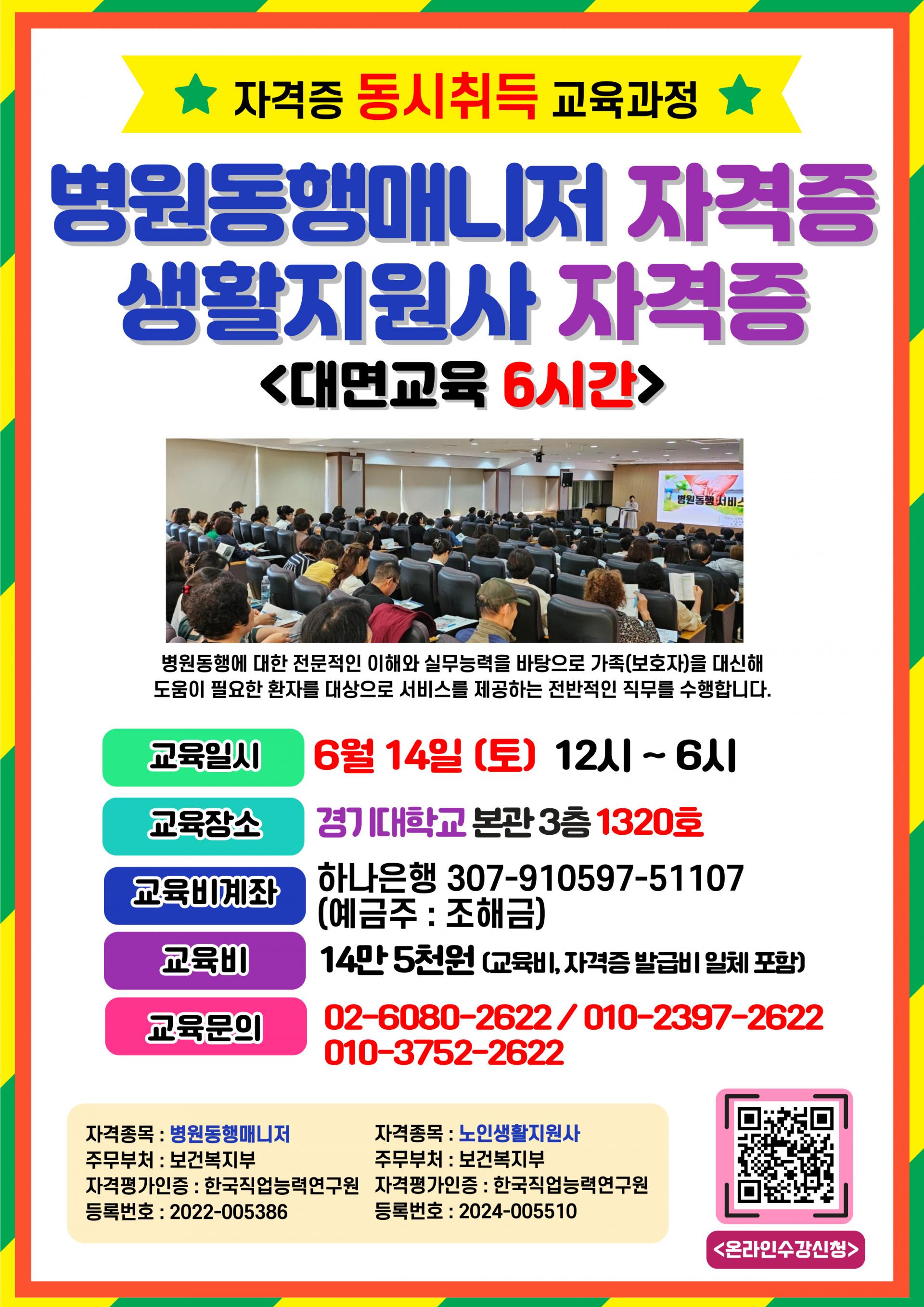 "병원동행매니저+생활지원사" 25년 6월 [6월 14일] 과정 교육생 모집 중에 있습니다.